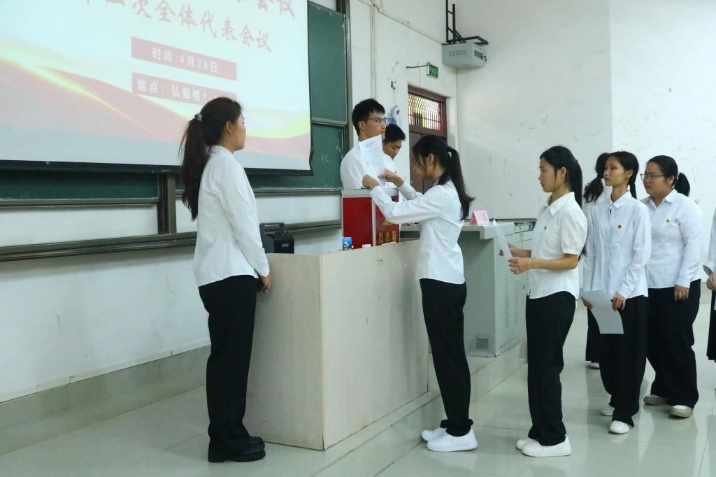 4月26日下午,ty8天游登录测速登录第六次学生代表大会在弘毅楼1-105教室召开。ty8天游登录测速登录党委常务副书记韦建益、院长江洪明、党委副书记陆俊先、副院长韦宏思受邀出席,校学生会代表、各二级学院学生会代表以及ty8天游登录测速登录55名学生参会。会议由ty8天游登录测速登录团委书记易万臣主持。