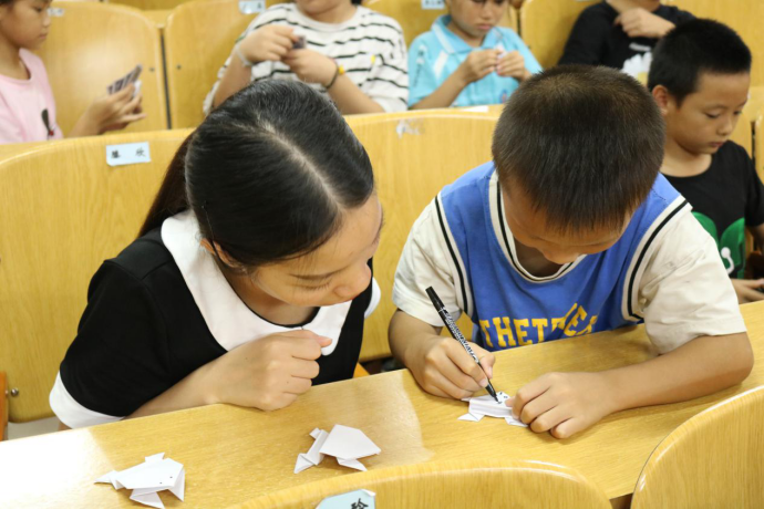 活动共分为三部分。一是开展课堂教学;二是进行手工实践;三是组织课外实践活动。林春柔采用寓教于乐的课堂教学双边活动,对小学生进行劳动启蒙教育;王香桃同学组织“手工教育课——折青蛙”教学;最后,梁彩红同学开展“开火车”,“你画我猜”等等集体游戏活动。三位同学分别采取不同教学方式对小学生开展劳动启蒙教育,深受小学生欢迎。