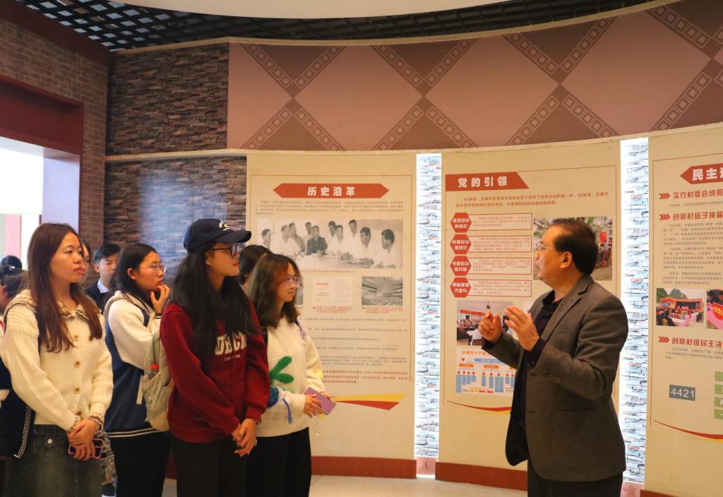 在“中国村民委员会发源地”的石碑前,改革先锋韦焕能同志向师生们讲述了我国第一个村委会诞生的过程,介绍了合寨村这40年来的翻天覆地的变化,表明了推动乡村振兴战略的决心。在讲解员的带领下,师生们来到村民自治展示馆,通过讲解员对合寨村的村民自治成果的生动介绍,让同学们在村民自治的基础上对“党群理事会”等乡村治理模式的不断创新,村民自治以及乡村振兴战略有了更为深入的了解。