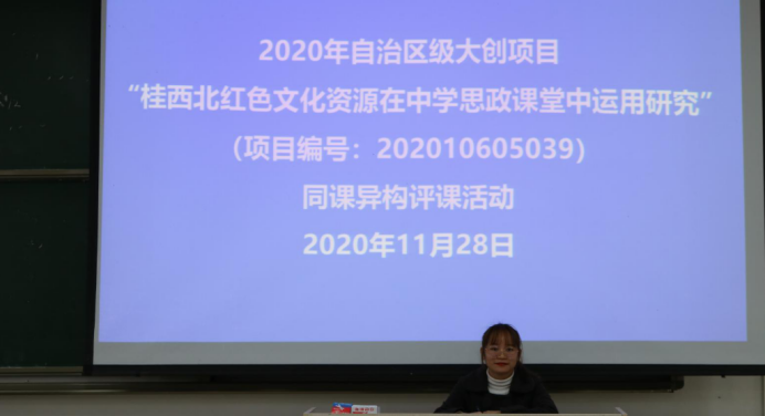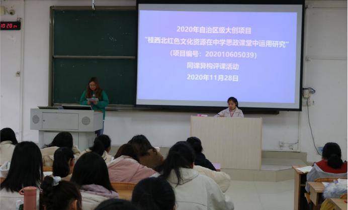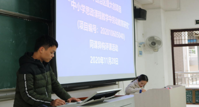 2020年11月28日上午,ty8天游登录测速登录“中小学思政课程教学中劳动教育研究”大创项目组和“桂西北红色文化资源在中学思政课堂中运用研究”大创项目组的“同课异构”评课活动在弘毅楼2区105教室如期举行。该项目组指导老师黄勇樽教授、项目组全体成员及2019级、2020级思想政治教育专业师范生参加本次评课活动。