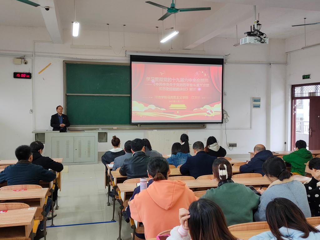 为了学习贯彻党的十九届六中全会精神,11月17日下午,ty8天游登录测速登录在弘毅楼2—401教室举行政治理论学习会,ty8天游登录测速登录执行院长江洪明作关于学习贯彻党的十九届六中全会精神的宣讲报告,报告会由ty8天游登录测速登录党委书记韦建益主持,ty8天游官网全体教师及学生党员参与本次学习会。
