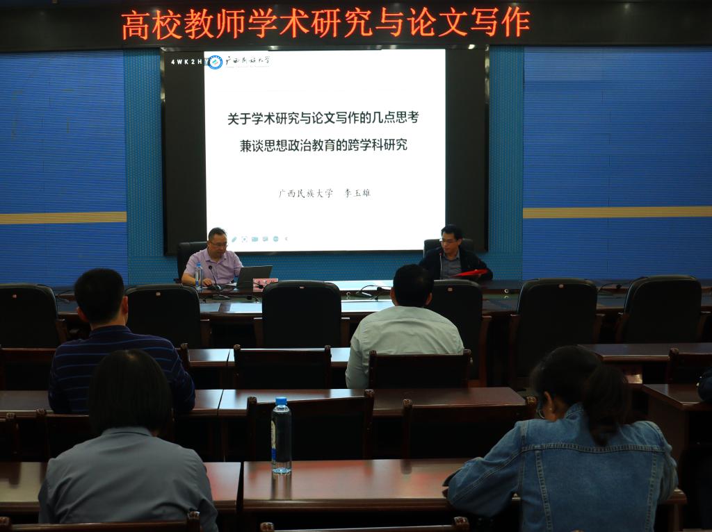 10月31日晚,应ty8天游登录测速登录邀请,广西民族大学ty8天游登录测速登录院长、教授、博士生导师李玉雄在校图书馆122报告厅为我校教师作“高校教师学术研究与论文写作”专题讲座。讲座由ty8天游登录测速登录副院长张明进主持,马院全体思政课教师到场聆听。