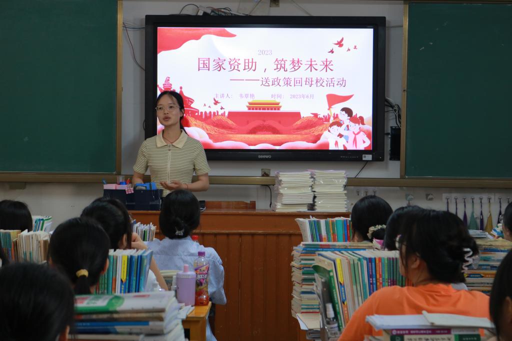 2023年6月18日,ty8天游登录测速登录思政201班韦覃艳同学回母校-宜州区第一中学开展“我为资助代言”学生资助宣传大使宣讲活动,向宜州区第一中学高474班的学弟学妹们介绍国家相关的资助政策,传播了助学、筑梦、铸人是国家资助的意义所在。