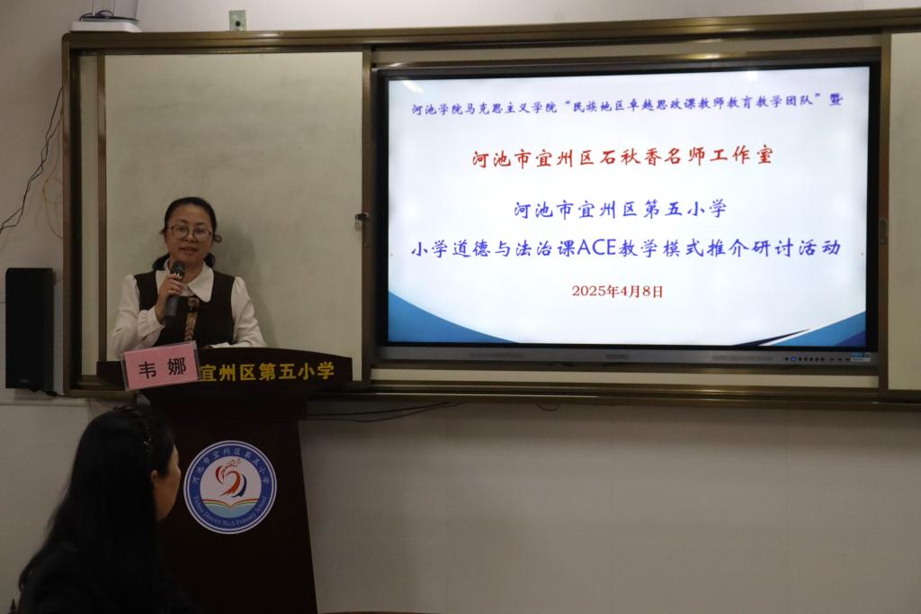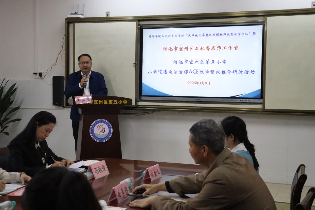 2025年4月8日,为深入贯彻落实习近平总书记关于思政课建设的重要指示精神,推进大中小学思想政治教育一体化建设,ty8天游登录测速登录与河池市宜州区第五小学举办“共建周”小学道德与法治课ACE模式推介研讨活动。ty8天游登录测速登录副院长韦宏思、“民族地区卓越思政课教师教育教学团队”负责人黄勇樽教授、教学团队成员陈金飞老师,河池市宜州区第五小学韦娜校长、思想道德与法治教研组任课教师,河池市宜州区石秋香名师工作室主持人石秋香老师、名师工作室名誉顾问梁秀华以及名师工作室成员们,天游ty8线路检测思想政治教育专业2022级、2023级师范生参加。本次活动由莫惠评和苏立科主持。
