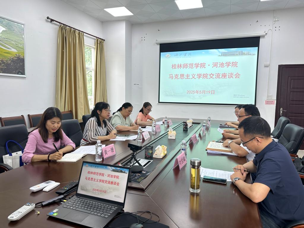 5月19日,桂林师范学院ty8天游登录测速登录谢华一行4人到ty8天游官网开展交流座谈会。副院长韦宏思、思政教研室主任覃英、副主任姚力月、原理教研室主任叶世斌、办公室主任韦沥雅参加会议。
