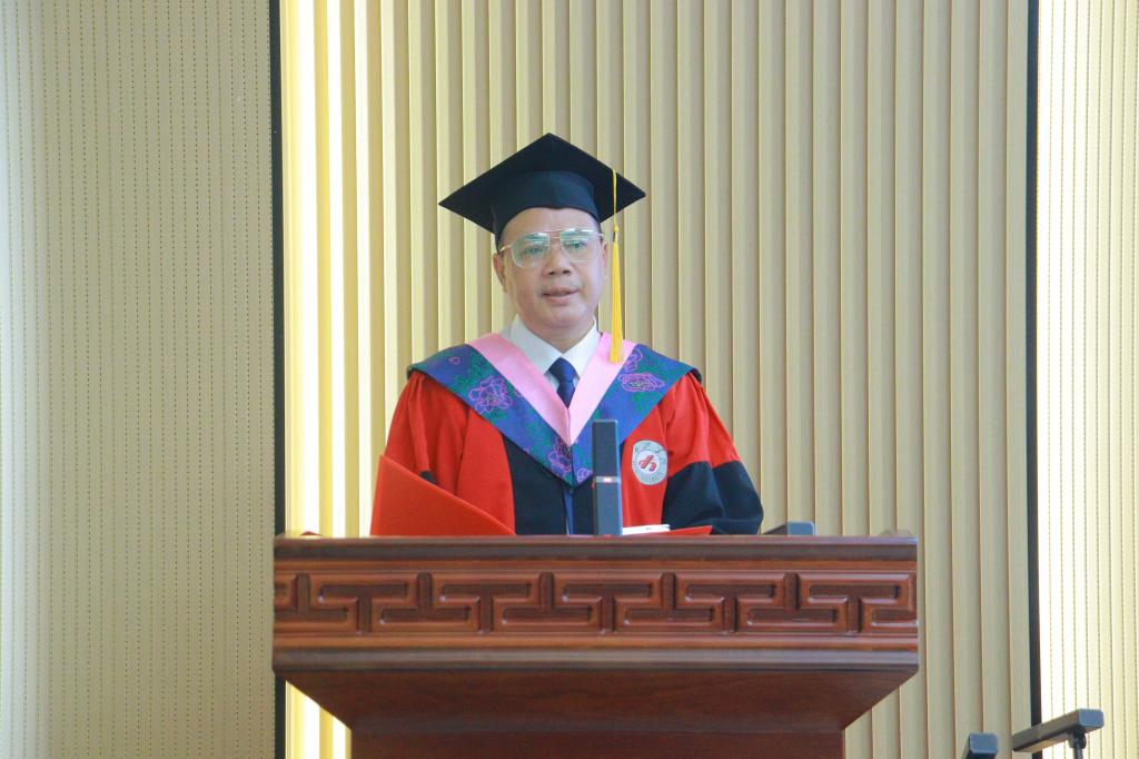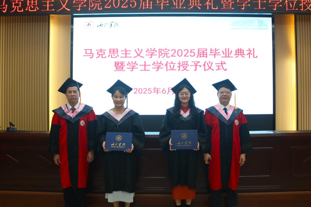 仪式在庄严激昂的国歌声中拉开帷幕。毕业生代表王迟深情致谢学院领导和老师的培养,回忆入学憧憬、成长点滴及学院发展,并表示将牢记使命开启新征程;在校生代表蓝秋棉表示,立志以师兄师姐为榜样成长为优秀思政人;毕业班班主任顾结龙回顾学生从青涩到成熟的蜕变过程,并期望马院学子铭记“知”与“行”,以奋斗照亮未来新征途。随后,江洪明代表全院师生向毕业生致以最热烈的祝贺,并语重心长地赠言毕业生:一是以“我命由我不由天”自信自立,以马克思主义实践向光明;二是以“敢叫天地沉大海” 的气概,勇毅前行;三是以“初心始终如一”的决心,做真理传播者。期盼同学们以马克思主义者之名,书写时代华章,前程似锦。